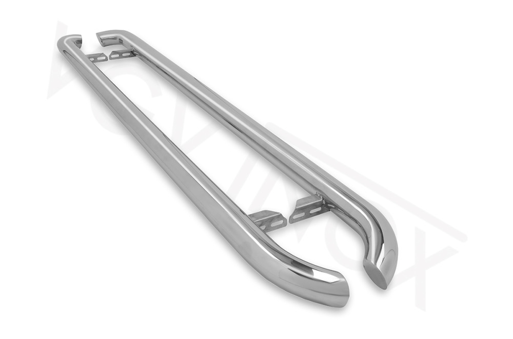 De sidebars van VGV INOX zijn gepolijst en zijn aan het begin en uiteinde diagonaal naar de dorpel gebogen. Uiteinden van de sidebars zijn volledig dichtgelast en vakkundig afgewerkt. Door middel van ovale sleufgaten kunt u tijdens de bevestiging de afstand van de sidebars zelf bepalen ten opzichte van uw voertuig.
