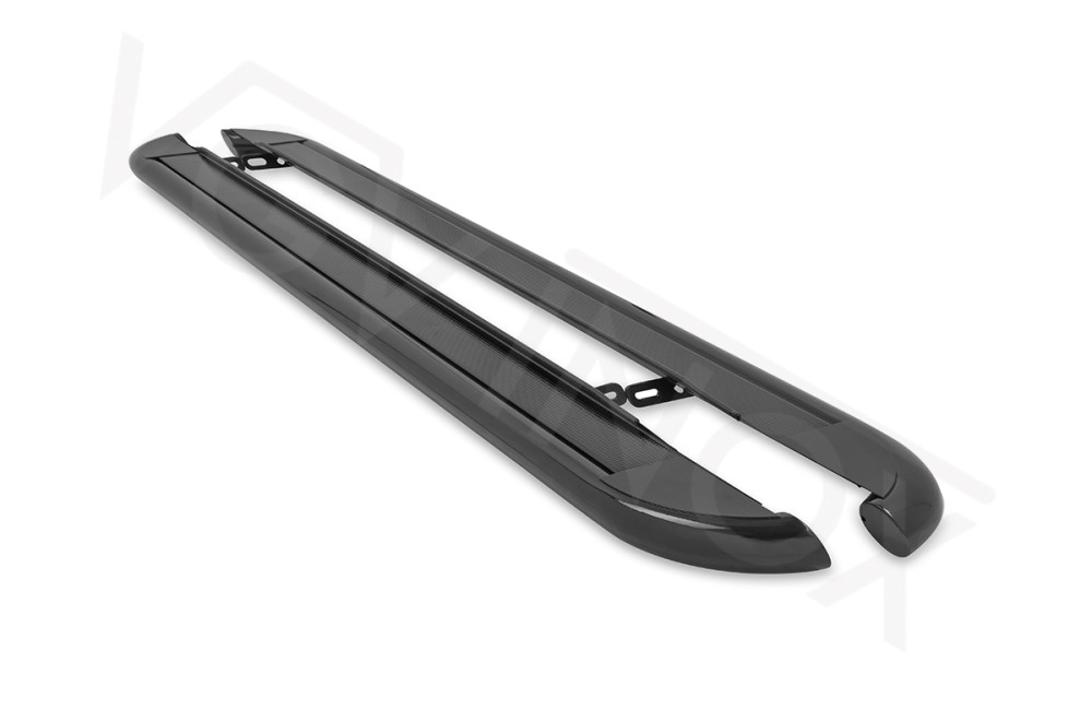 De sidebars van VGV INOX zijn glans zwart afgewerkt welk aan het begin en uiteinde horizontaal naar de dorpel gebogen zijn en met een luxueus traanplaat boven dicht afwerkt zijn. Uiteinden van de sidebars zijn volledig dichtgelast en vakkundig afgewerkt. Door middel van ovale sleufgaten kunt u tijdens de bevestiging de afstand van de sidebars zelf bepalen ten opzichte van uw voertuig.